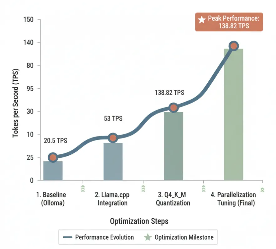 性能演进:我的优化路径清晰地体现在 TPS 的逐步提升上。基线 Ollama 约为 20.5 t/s;替换为 llama.cpp 后提升至约 53 t/s;应用 Q4_K_M 量化后达到约 95 t/s;最终经过并行计算调优,峰值性能达到 138.82 t/s。