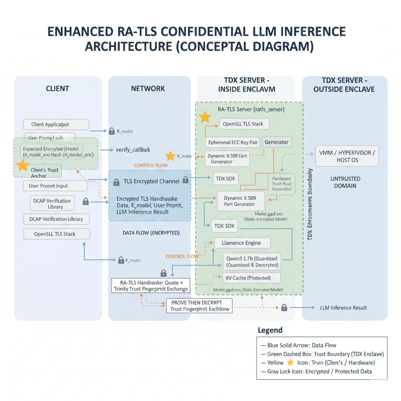 该方案的核心是一种创新的“三位一体信任指纹”机制,它在增强型远程证明协议(RA-TLS)中,通过密码学手段将应用程序、加密模型和会话密钥三者的哈希值绑定在 X.509 证书的扩展字段中,实现了“我正在与正确的程序、正确的模型、在正确的硬件上、通过正确的会话密钥通信”的可验证性。