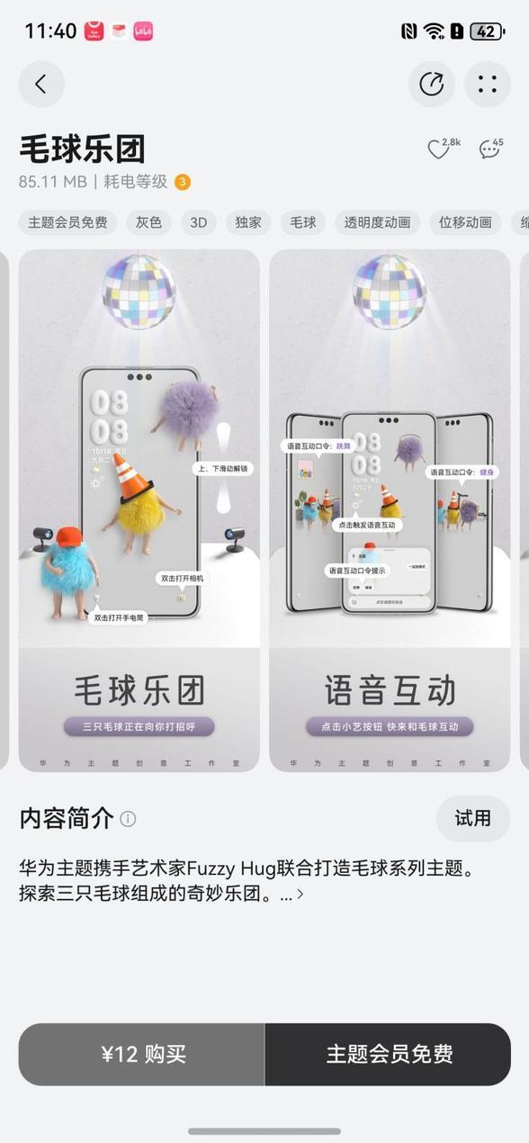 各花入各眼,有没有朋友跟我一样觉得《毛球乐团》主题好热闹,一次性可以跟三个毛茸茸的小家伙一起玩,它们打扮各有特色,可以在锁屏的小艺中通过输入跳舞、健身来切换毛球状态,形态可爱、动作搞怪,太惹人爱了。