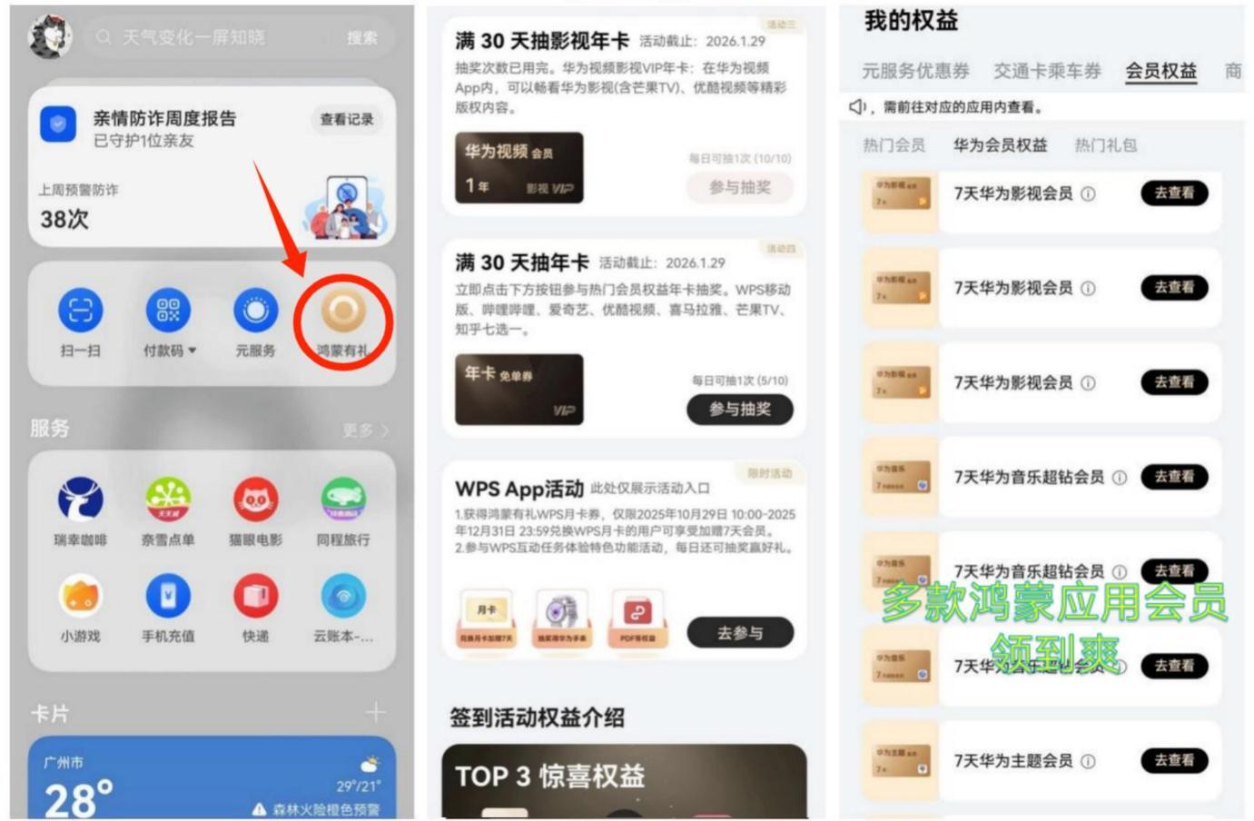 更让人心动的是,完成首签后第 30 天(中间断签也没关系),还能解锁两个年卡抽奖活动机会。一个是抽影视 VIP 年卡礼包:送 12 个月华为视频+优酷视频会员,另一个则是抽热门应用年卡免单券:爱奇艺、WPS、优酷视频和哔哩哔哩等 App 会员年卡任选其一,如果真的能欧气爆棚,那么未来一年的影音娱乐自由就有了!