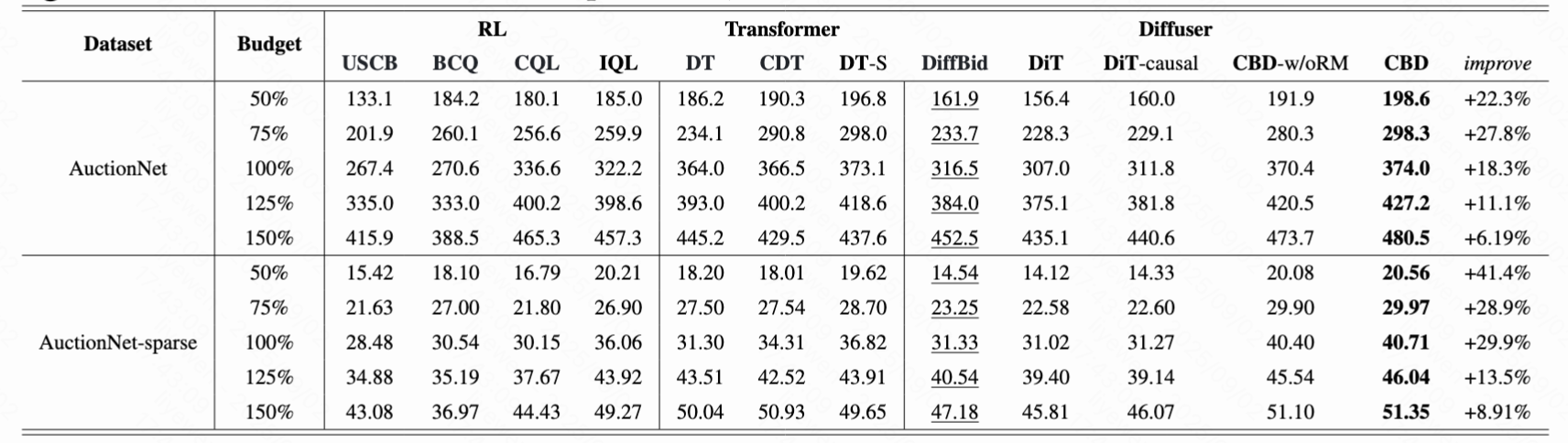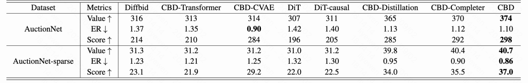 我们在 AuctionNet 公开出价数据集上测试 CBD 以及基线算法性能(包括离线强化学习和 DT 等生成模型方法)。表 2 展示了不同预算及奖励稀疏程度下,各算法所竞得的总转化价值(Value)。实验结果表明,CBD 算法显著优于其他方法。同时,生成轨迹的可视化结果(图 4)显示,CBD 能有效缓解 Diffuser 直接应用时出现的问题。表 3 中的消融实验进一步验证了扩散模型结构的有效性以及 Completer–Aligner 框架的必要性。
