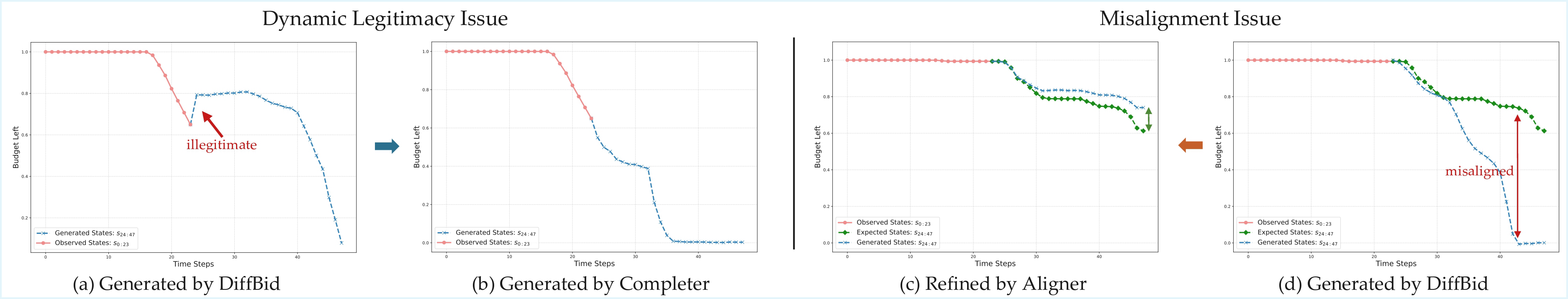 若直接将 Diffuser 应用于广告出价,在推理时需在每个调价步 t 生成整条状态轨迹\{s_0,...,s_t,...,s_T\},然后根据生成的未来状态序列\{s_{t+1},...,s_T\}和真实观测的状态序列 jishu 推演出此时的出价。但由于竞价环境的动态性,真实观测状态序列和生成的未来状态序列往往存在不一致,导致两个突出问题(如图 4 所示):