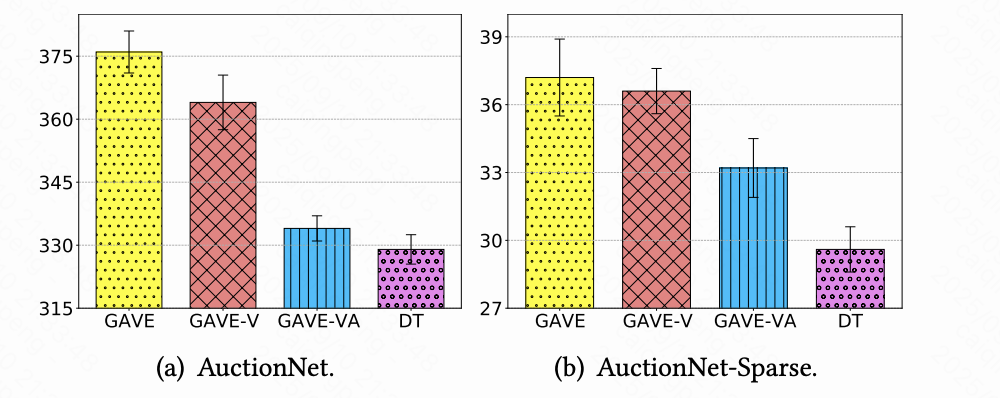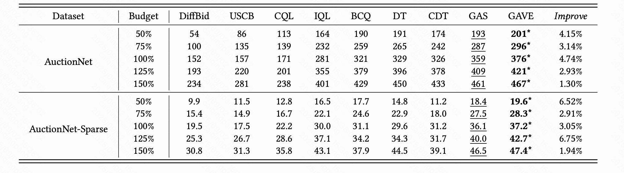 我们在 AuctionNet 公开出价数据集上测试 GAVE 以及基线算法性能。如表 1 显示,GAVE 在不同预算设置与数据条件下均取得最优效果,其相对于 DT 的显著提升验证了基于价值函数的动作探索机制的有效性。消融实验(图 3)进一步证明了 Score-based RTG 模块与动作探索机制的必要性。