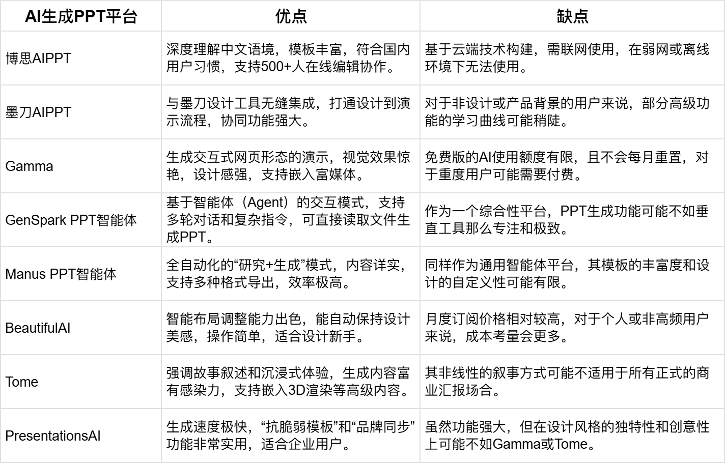 前面介绍的每一款 AI 生成 PPT 工具都有其独特的魅力和适用场景,但也不可避免地存在一些局限。为了让你能更清晰地了解它们的差异,做出更适合自己的选择,下面为你整理了前述 8 款一键生成 PPT 的 AI 软件的优缺点——