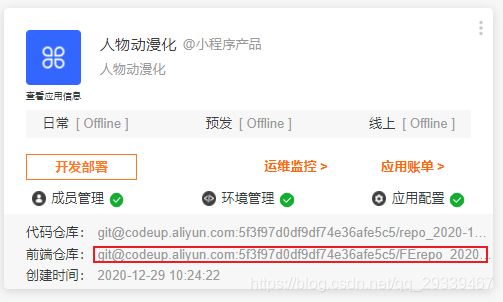 在应用界面,我们可以看到两个代码仓库,一个是后端代码(也就是 IDE 里面的),另一个是前端代码,这里我们需要通过 git 将前端代码克隆本地进行调试,点击前端仓库
