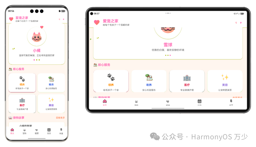 《宠知汇》通过 HarmonyOS 的一次开发,多端部署能力,实现了应用在不同设备形态上的完美适配。基于统一的 ArkTS 开发框架,应用能够智能识别设备类型和屏幕尺寸,自动调整界面布局和交互方式。