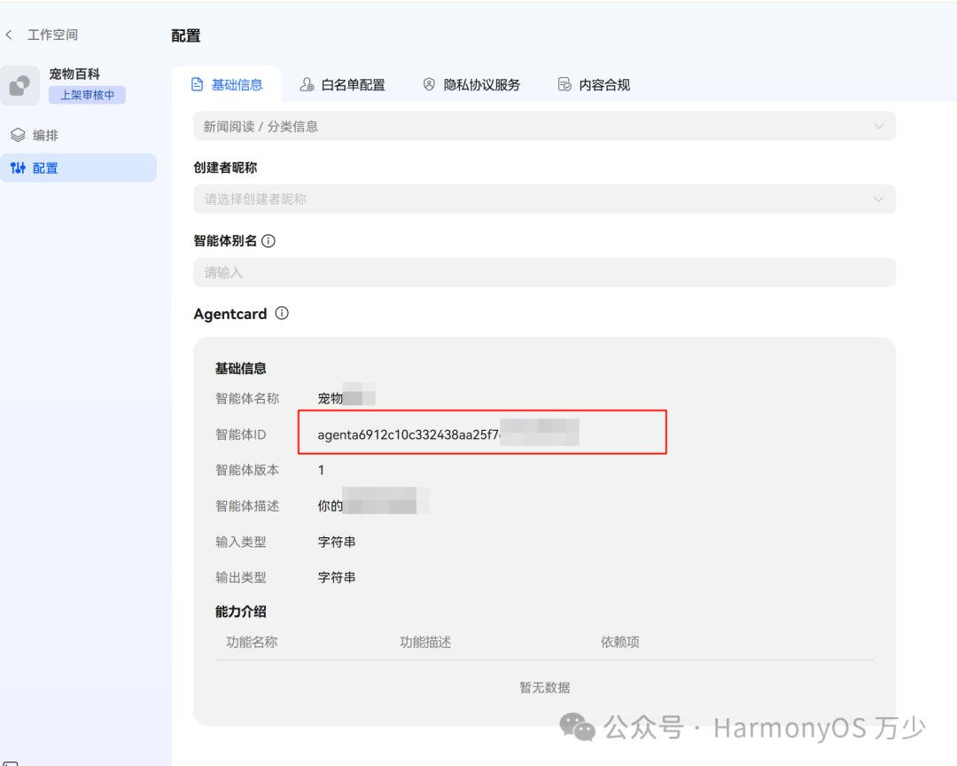 如果上架成功,想要让这个智能体给你的鸿蒙应用服务,需要在配置页面中,添加你的应用