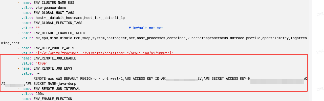 调整 datakit.yaml,新增以下内容,填写 aws 相关配置。调整完成后,重新执行 apply 操作。