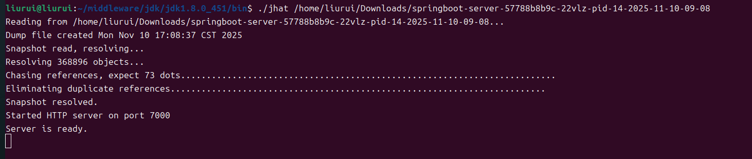 可以使用 jhat 命令解析 dump 文件,并用浏览器直接查看,格式 jhat <dump-file-name> 。