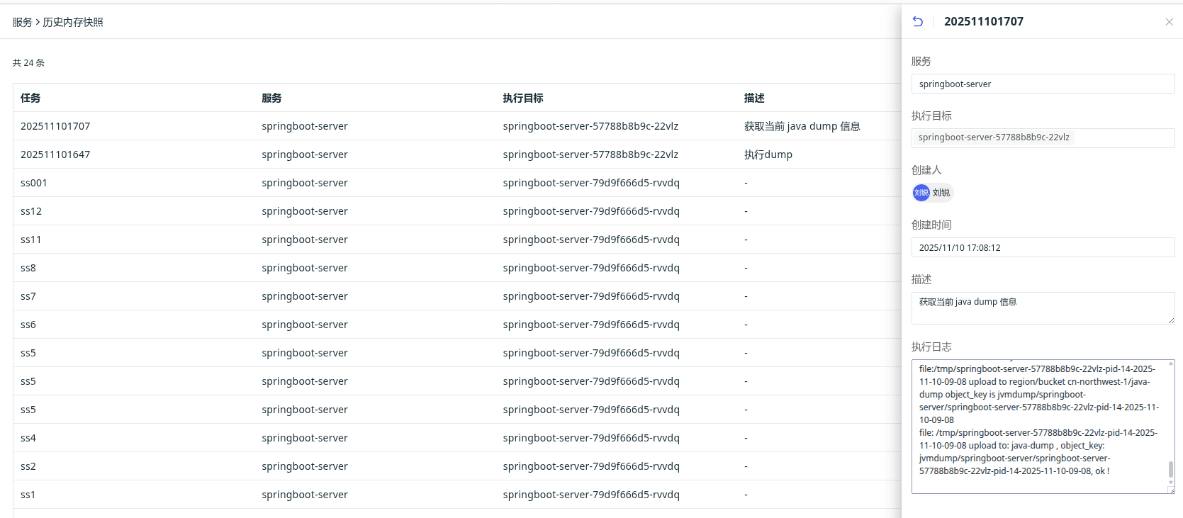 登录观测云平台,应用性能监测 - 服务 - 服务清单,选择对应的 java 服务,点击创建内存快照按钮进行创建。