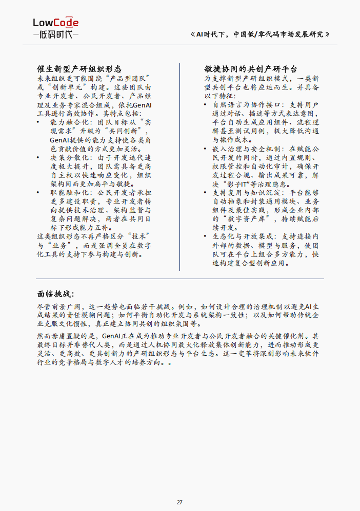 长期来看,GenAI 将推动开发者的进一步融合——专业开发者与公民开发者的界限模糊,催生新型产研组织与共创平台。
