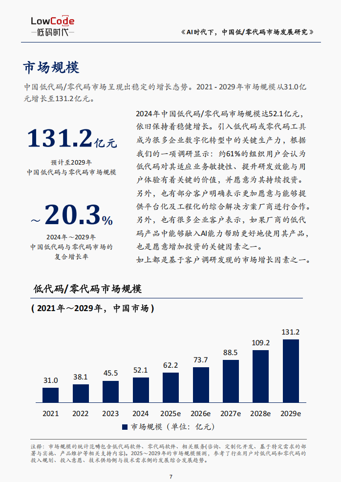 市场规模数据印证了这一转变:从 2021 年的 31.0 亿元到 2029 年预期的 131.2 亿元,这条增长曲线背后,是企业对低代码价值认可的实质性提升。