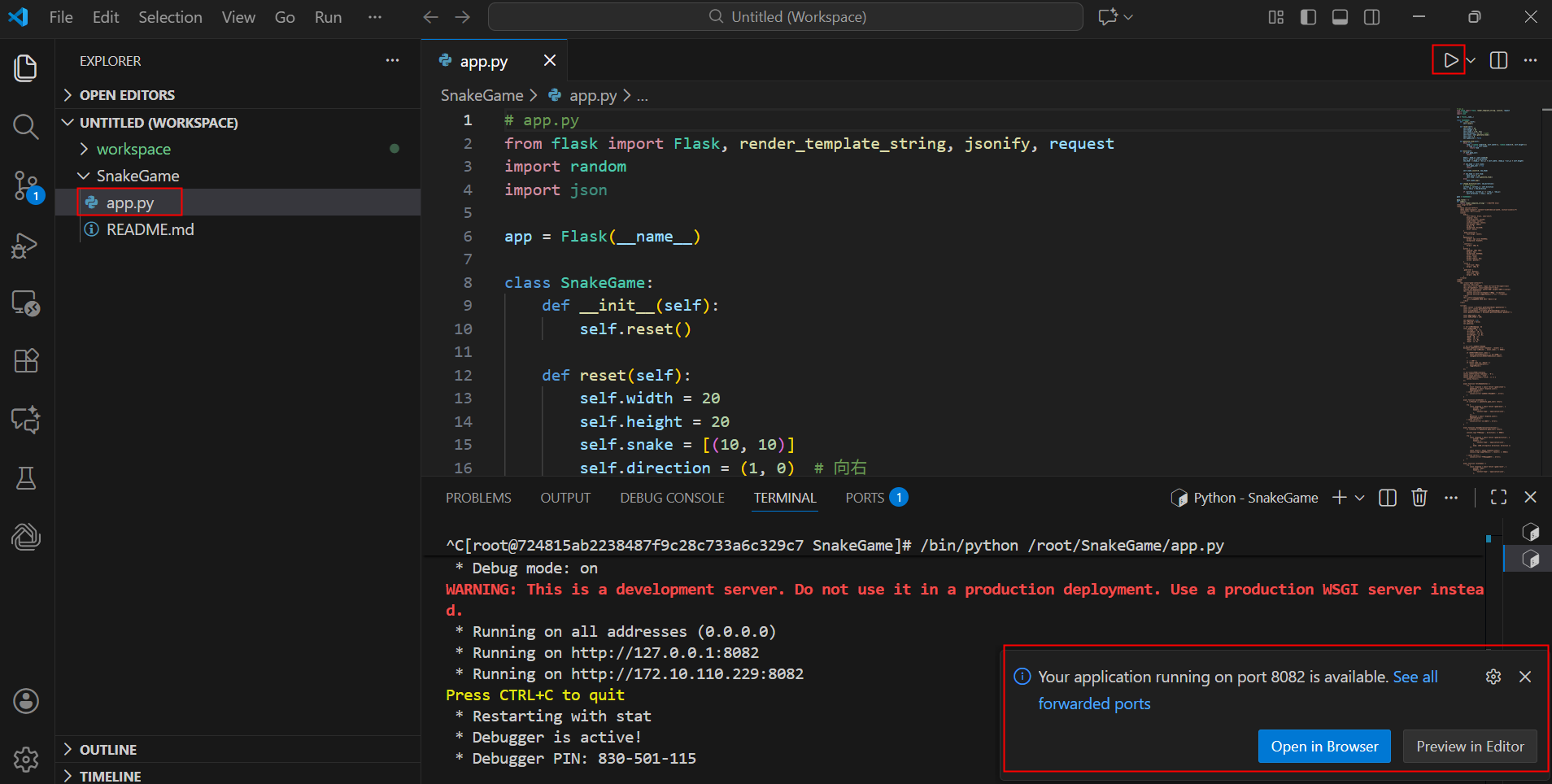 点击Open in Browser,即可在浏览器中体验贪吃蛇小游戏。