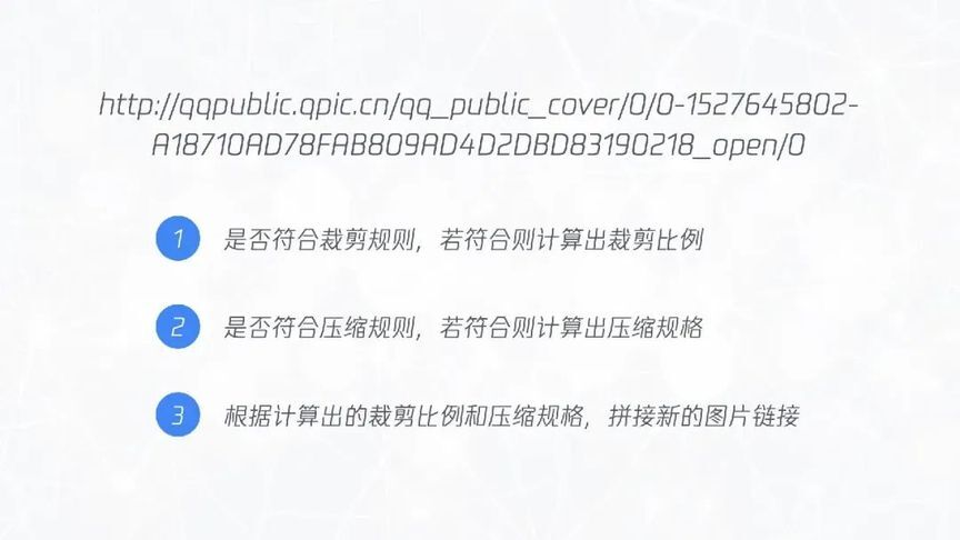 判断原图链接是否符合裁剪规则,如果符合就计算出最优裁剪比例。不能随便给个 https://qq.com 就直接去裁剪了,要对链接进行校验;判断原图链接是否符合压缩规则,如果符合就计算出最优压缩规则。道理与上面类似,有的图片不支持压缩,因此也需要判断;拼接新图链接。