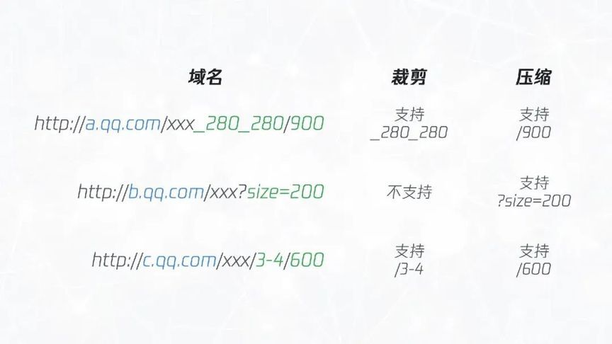 这还没完,突然产品经理说:“再支持两个新域名”。由于一些历史原因,司内存在不少相似的服务,但能力都大同小异,都是通过改变链接中的参数来修改图片的裁剪和压缩尺寸。比如下图所示,有的域名同时支持裁剪和压缩,但需要直接修改路径;有的域名不支持裁剪,参数也是通过 query 形式传入。因此我们需要针对不同域名进行不同判断。