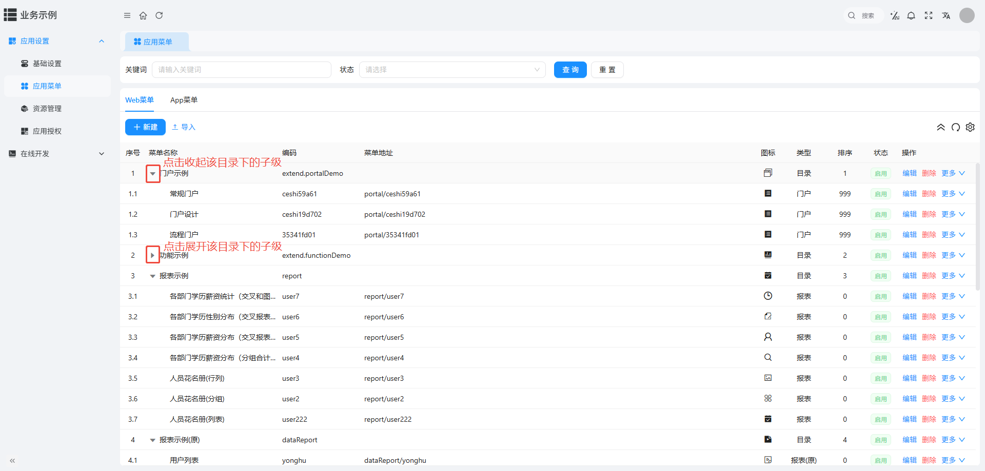 “应用菜单” 是统一管理单个应用下 Web 端和 App 端菜单的入口,比如给 “人事 OA” 应用配置 “员工信息表单”“考勤门户” 等菜单,用户只有配置权限后才能在应用前台看到。