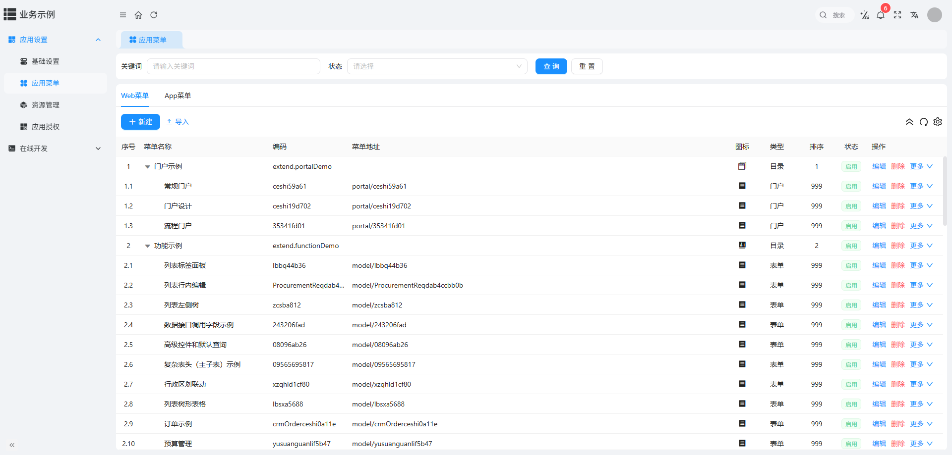 操作步骤:选端:确定建 Web 菜单还是 App 菜单,点击 “+ 新建”;填信息:上级菜单:下拉选父节点(如把 “员工表单” 归到 “人事管理” 目录下);类型:除了 “字典” 读取全局数据,“表单”“流程”“门户” 等都只读取当前应用的数据(比如建 “流程” 类型菜单,只能选当前应用下的流程);路由地址:手动填或自动生成(表单菜单默认 “model / 编码”),必须当前应用内唯一;点 “确定”,菜单会显示在列表中,默认启用。