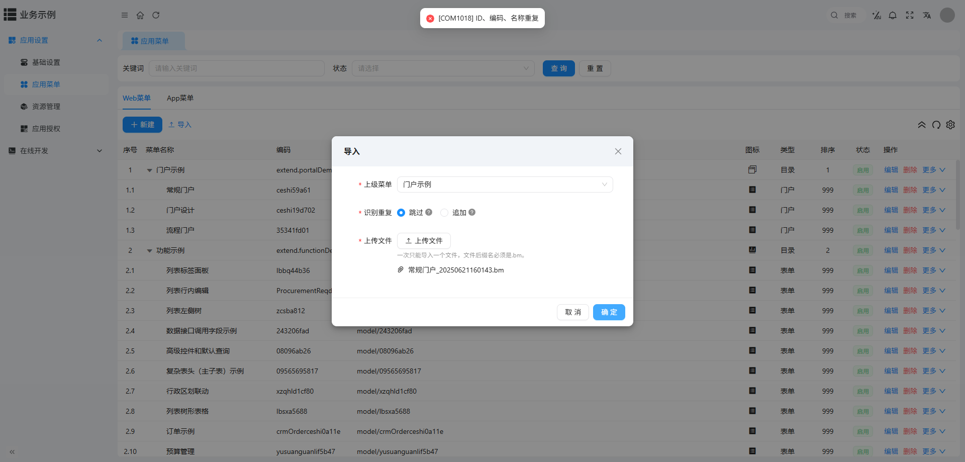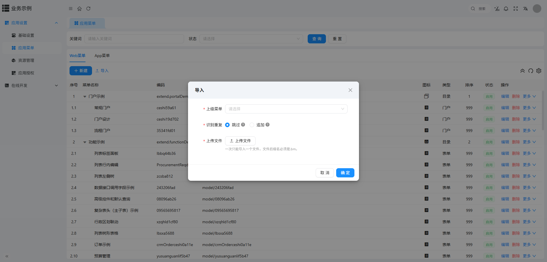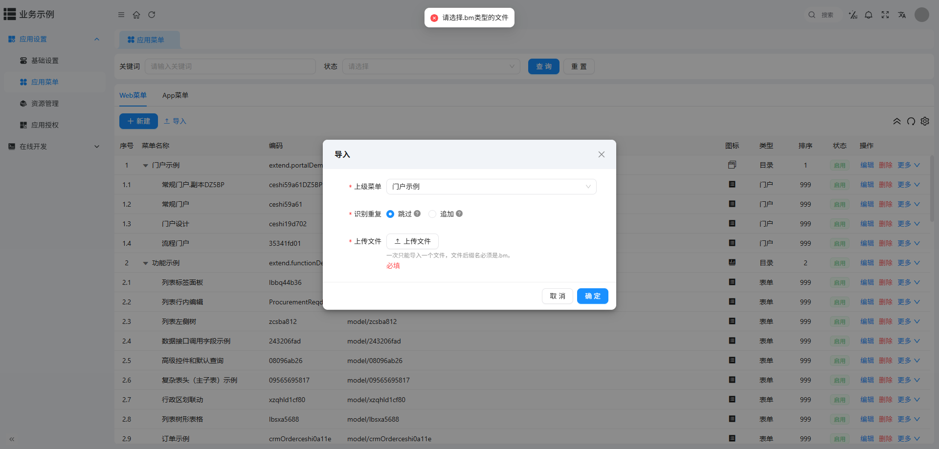 导入操作:点击 “↑导入”,选上级菜单(导入的菜单会归到这个父节点下);设重复规则:跳过:导入数据已存在(编码 / 名称重复)则提示 “ID、编码、名称重复”,不导入;追加:已存在则自动生成副本(名称加 “副本 + 5 位随机码”,编码加随机码),比如 “员工表单” 变成 “员工表单。副本 DZ5BP”;上传.bm 文件:只能传.bm 格式,传其他格式会提示 “请选择.bm 类型的文件”。