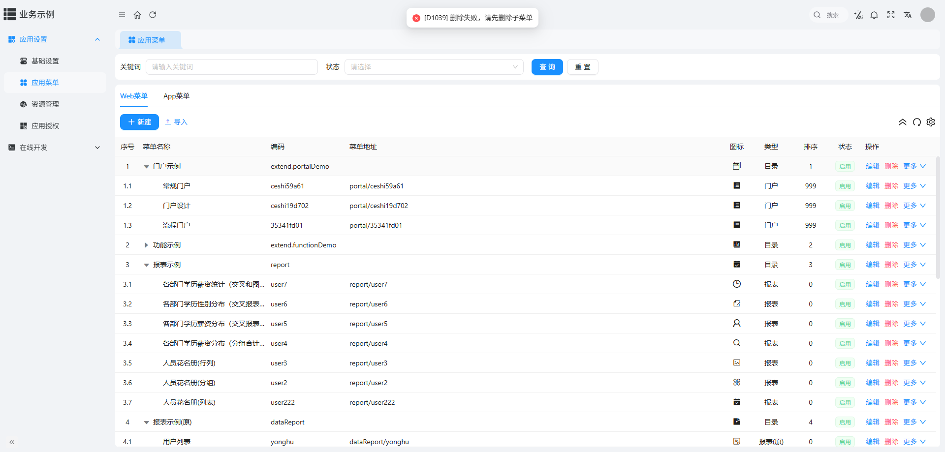 删主目录:若目录下有子菜单(如 “人事管理” 下有 “员工表单”),点击删除会提示 “删除失败,请先删除子菜单”,必须先删完所有子菜单,才能删主目录。
