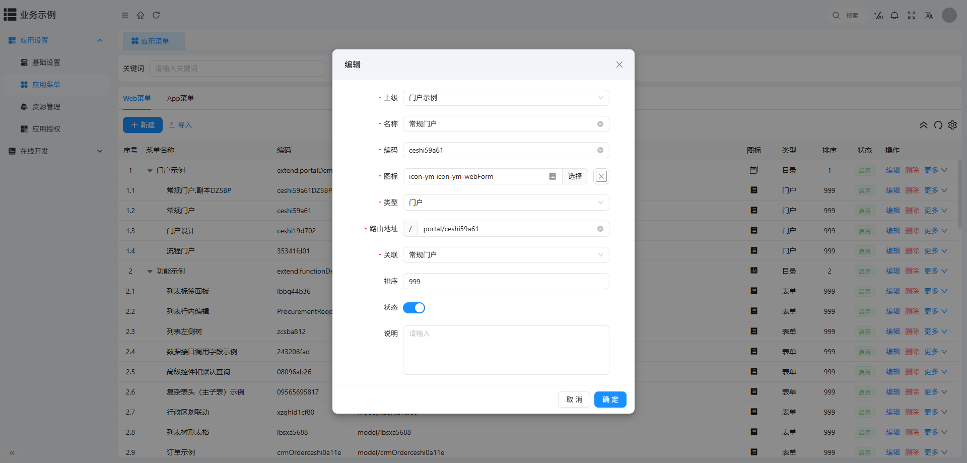可修改项:包括上级菜单、名称、编码、类型、路由地址等所有配置,比如把 “员工表单” 的上级从 “人事管理” 改成 “员工管理”;