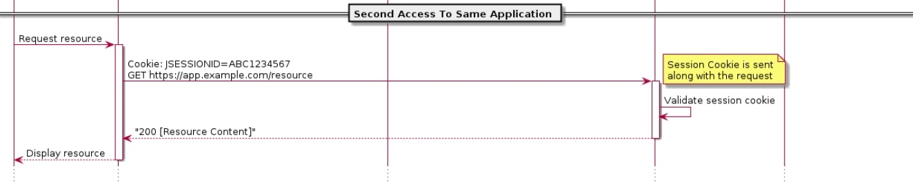 如上图所示,我们在浏览器(Browser)中访问一个应用,这个应用需要登录,我们填写完用户名和密码后,完成登录认证。这时,我们在这个用户的 session 中标记登录状态为 yes(已登录),同时在浏览器(Browser)中写入 Cookie,这个 Cookie 是这个用户的唯一标识。下次我们再访问这个应用的时候,请求中会带上这个 Cookie,服务端会根据这个 Cookie 找到对应的 session,通过 session 来判断这个用户是否登录。如果不做特殊配置,这个 Cookie 的名字叫做 jsessionid,值在服务端(server)是唯一的。