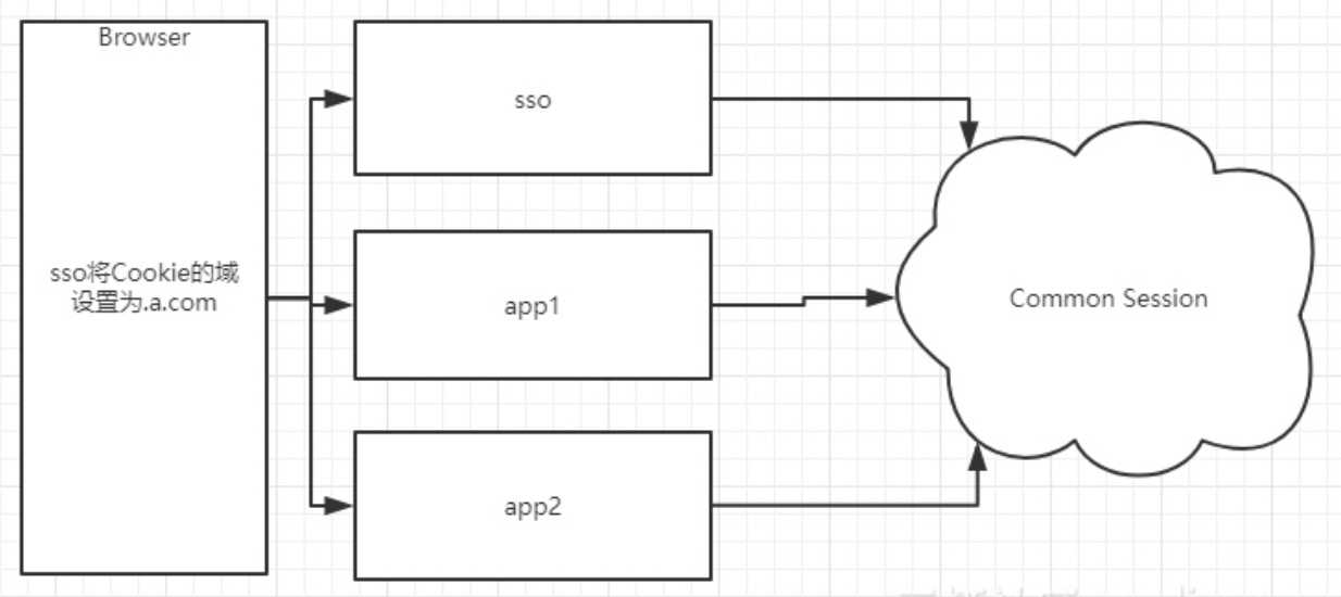 我们只要在sso.a.com登录,app1.a.com和app2.a.com就也登录了。通过上面的登陆认证机制,我们可以知道,在sso.a.com中登录了,其实是在sso.a.com的服务端的session中记录了登录状态,同时在浏览器端(Browser)的sso.a.com下写入了 Cookie。那么我们怎么才能让app1.a.com和app2.a.com登录呢?这里有两个问题: