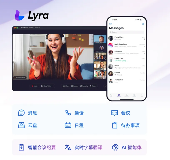 在通信基础能力之上,Lyra 进一步整合了多项 AI 核心模块,包括智能会议纪要生成、实时多语种字幕翻译、企业级 AI 智能体交互等,实现从“连接”到“赋能”的跃升。