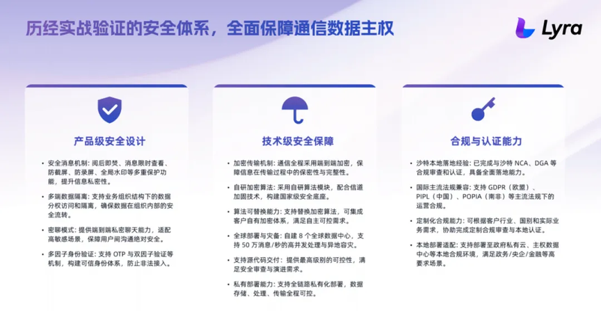 同时,Lyra 构建了历经实战验证的全链路安全体系,从产品设计、底层技术、合规和本地化等方面全面保障通信数据主权,为国家级通信平台提供坚实可靠的安全底座。