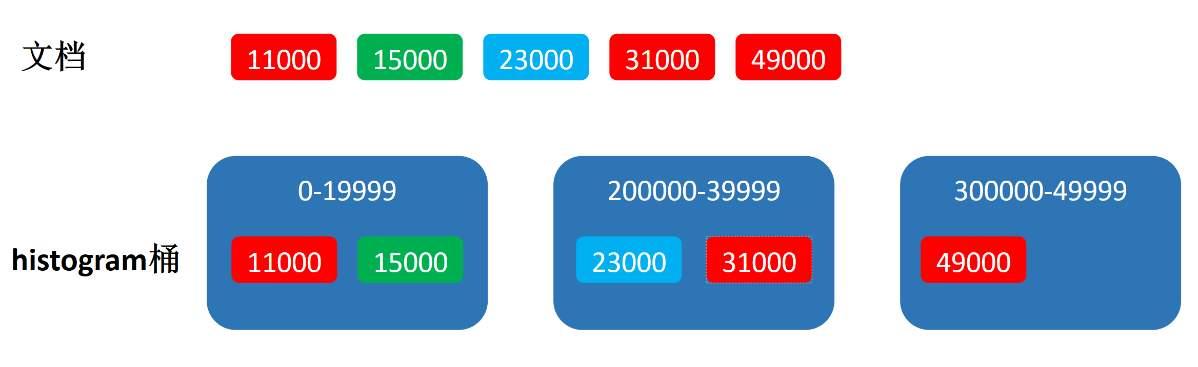 还记得 terms 桶么,用来将指定字段值相同的文档聚合在一个桶中,而 histogram 桶是将指定字段值在某个范围内的文档聚合在一个桶中,如下图所示,0-19999 是一个桶,11000 和 15000 在一个桶内,23000 和 31000 在一个桶内,这就是 histogram 桶: