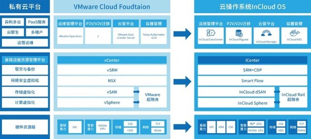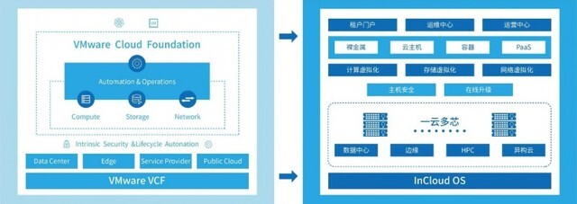 * 智能高效,统一运营运维:异构云平台统一纳管,实现 VMware 便捷运维,统一管理,云资源自动调度,应用级异构编排,租户运营,计量计费,流程管理。