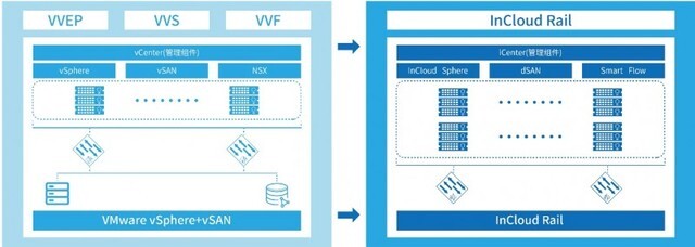 浪潮云海 InCloud Rail 超融合系统基于基于“硬件重构+软件定义”架构,具有去耦合、可重构、自动化、整体性、弹性化、高扩展灵活选配等特点,帮助用户快速构建云数据中心,降低 TCO 和复杂性,并且能够灵活扩展、快速交付。可以有效替代替代 VMware HCI 并实现迁移体验与扩展性的双重升级。