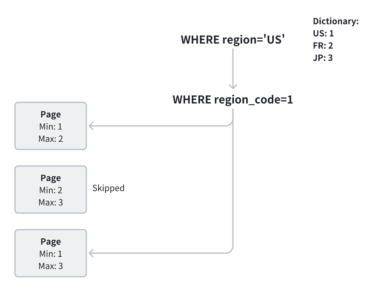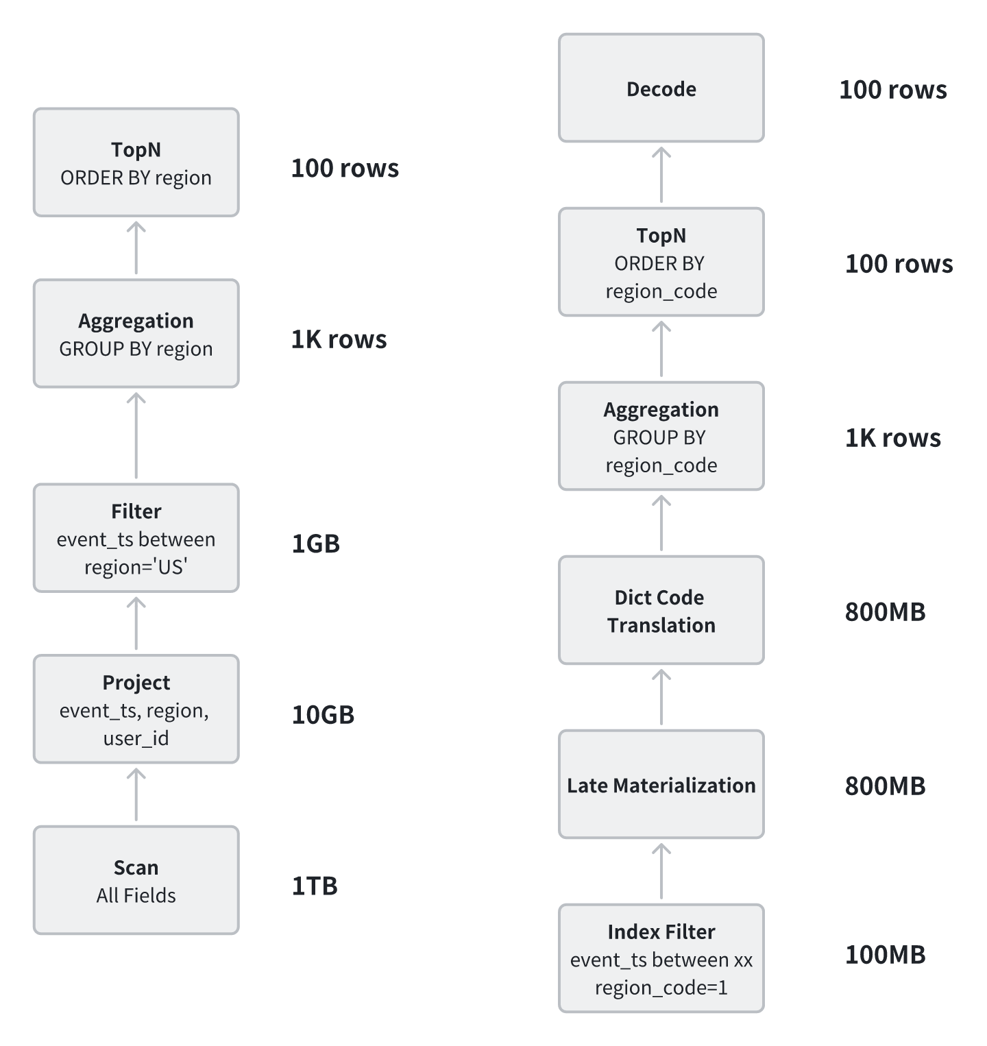 region='US'需要逐字符比较,CPU 热点函数可能 80-90% 都耗在解析和比较上聚合阶段又要基于字符串做哈希和去重,无法利用字典编码进行优化