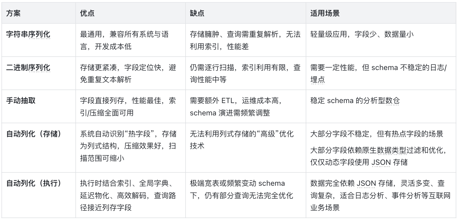不过,这种方案的实现极具挑战——系统需要智能地处理异构 schema、 schema 演进等复杂问题。因此,各数据库产品在这一方向的优化深度差异很大。
