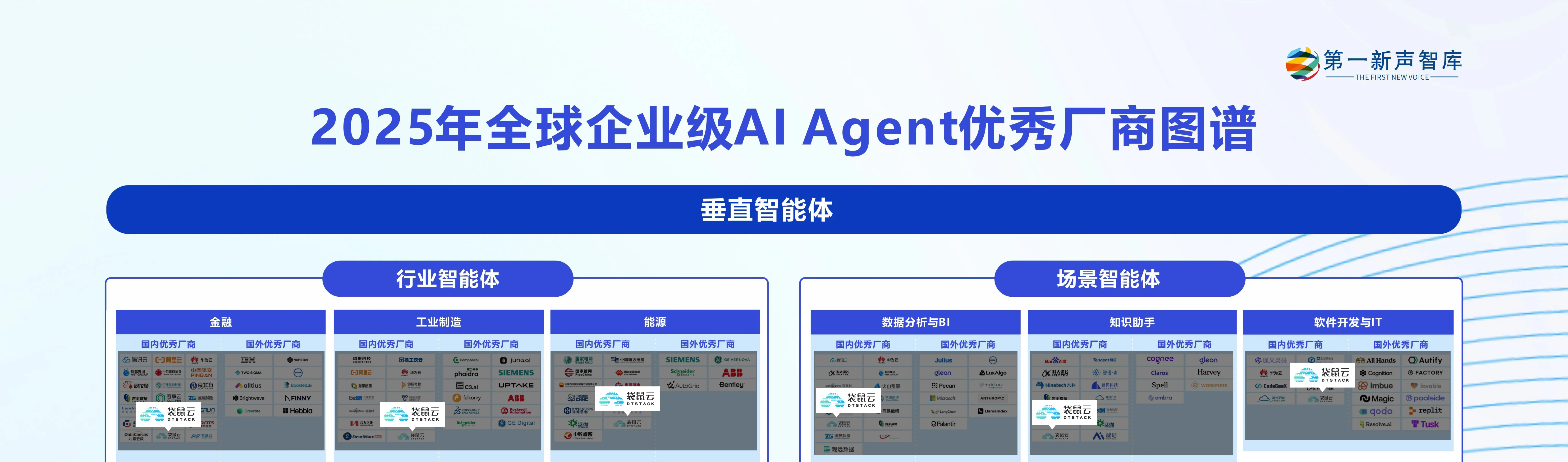 近日,国内 IT 市场研究与咨询机构「第一新声」正式发布《2025 年全球企业级 AI Agent 优秀厂商图谱》,从行业智能体、场景智能体等多个维度遴选出国内外代表性企业。袋鼠云凭借在 AI Agent 领域的技术创新及行业场景深耕实践成功入选图谱,成为行业智能体板块中金融、工业制造、能源三大细分领域,以及场景智能体板块中数据分析与 BI、知识助手、软件开发与 IT 的代表厂商。