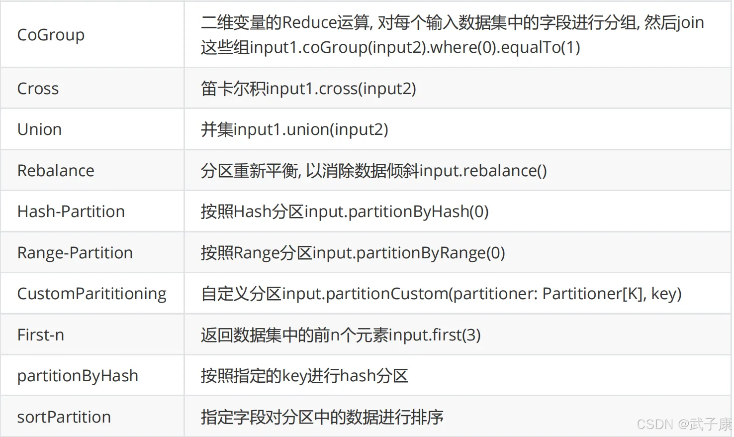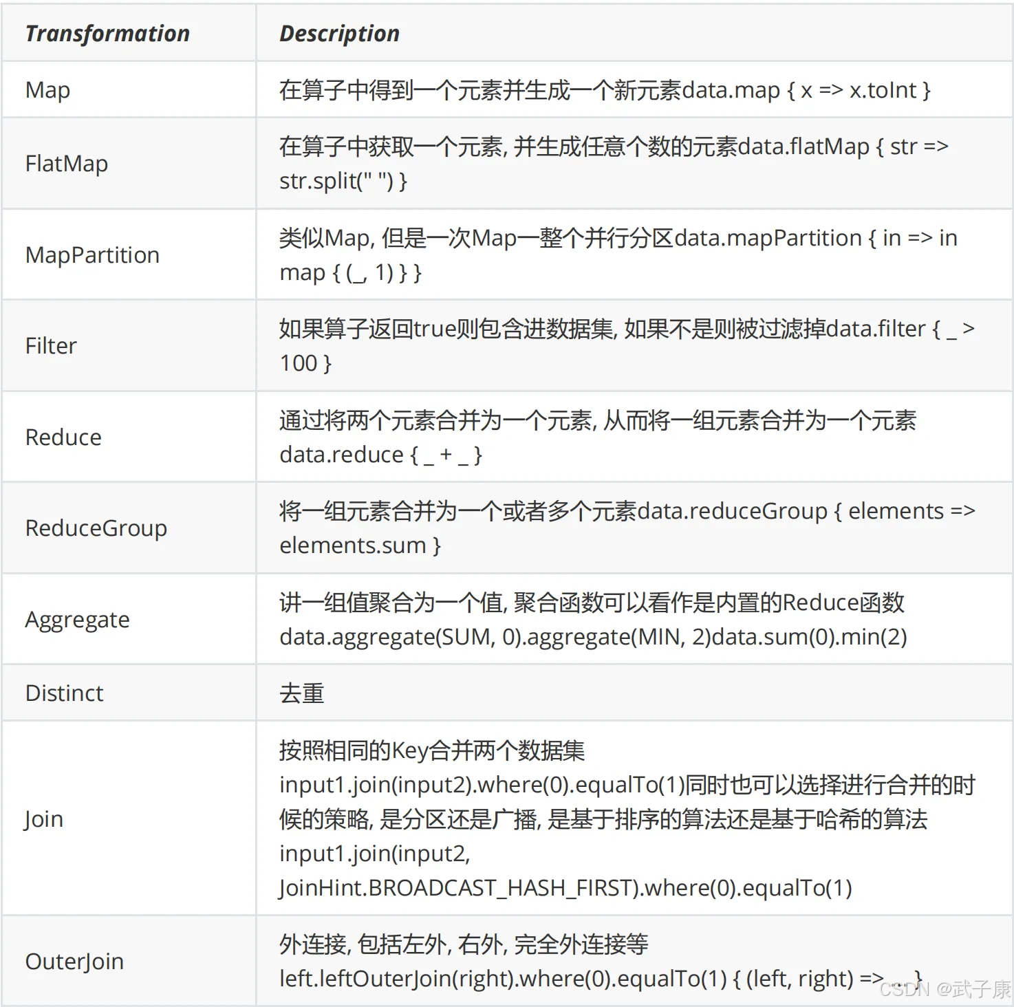 Flink 的 DataSet API 提供了丰富的转换操作,可以对数据进行各种变换,以下是常用的转换操作: