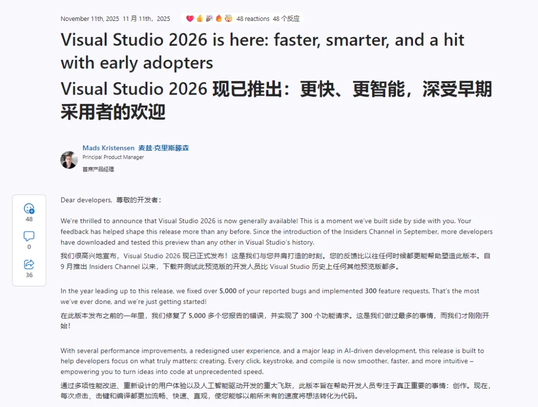 文章简介: 前不久 Visual Studio 官方博客宣布 Visual Studio 2026 正式发布!本次版本凝聚了广大开发者的宝贵反馈,博客中提及在此版本发布之前的一年里,Visual Studio 团队修复了 5000 多个用户报告的缺陷,并实现了 300 个功能请求。新版本带来显著性能提升、全新用户体验和更强的 AI 开发能力,让编码更流畅、高效,助您更快将创意变为现实。