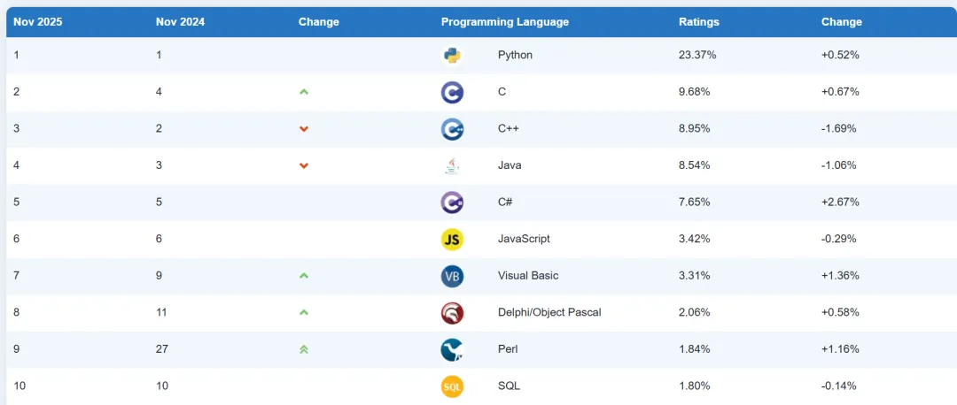 文章简介: C# 涨幅达 2.67%,与 Java 的差距缩小至不足 1%,未来存在超越 Java 的可能性,但尚未实现历史性超越。2025 年 11 月,C# 以 2.67%的涨幅成为榜单中增长最快的语言,排名升至第五。