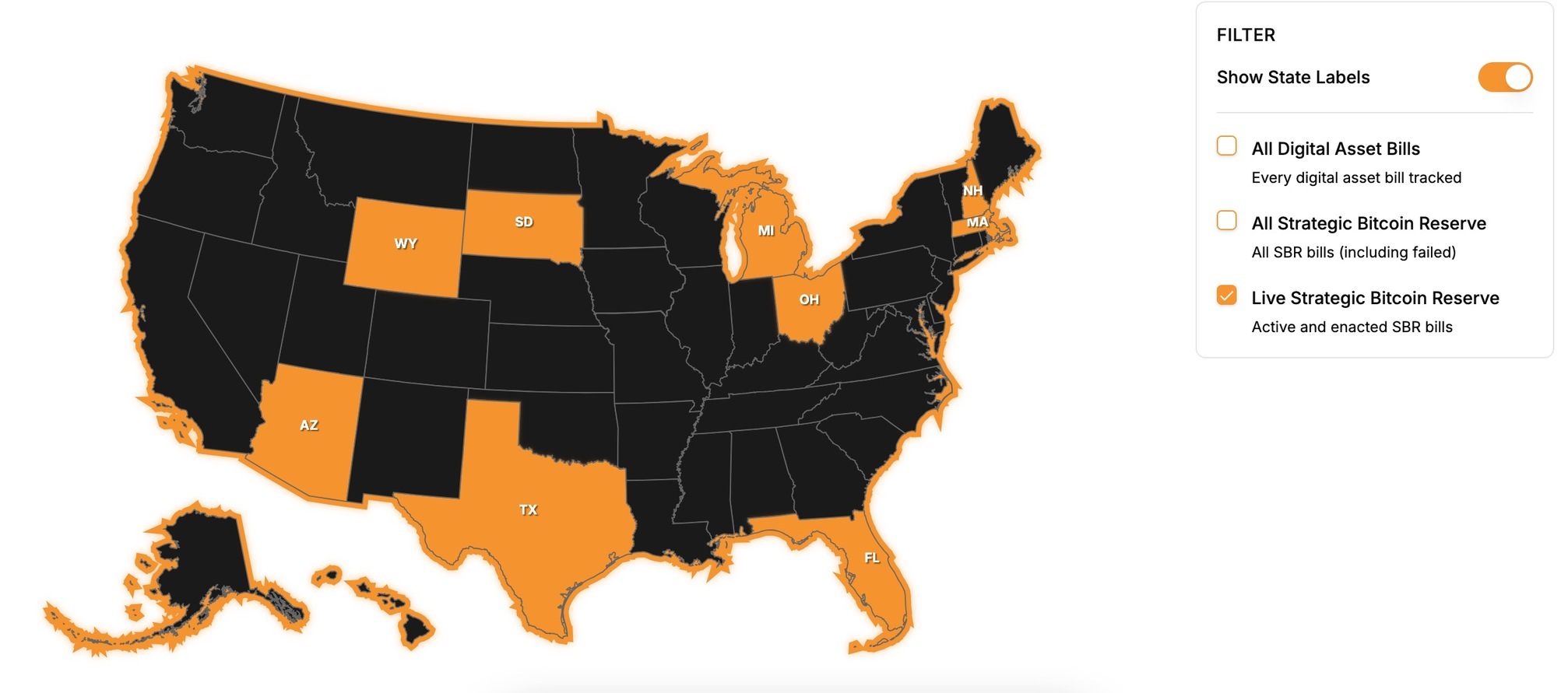 然而,立法进程并非一帆风顺。多数州在提案后陷入停滞,部分法案甚至被撤回或直接否决,真正进入实质阶段的寥寥无几。据 Bitcoin Laws 统计,截至目前,全美仅三个州正式通过了州级战略比特币储备法案,按顺序依次是亚利桑那州、新罕布什尔州、以及德克萨斯州。除上述三州之外,目前仍在推进 SBR 法案的也只有佛罗里达州、南达科他州、怀俄明州、密歇根州、俄亥俄州、马萨诸塞州。