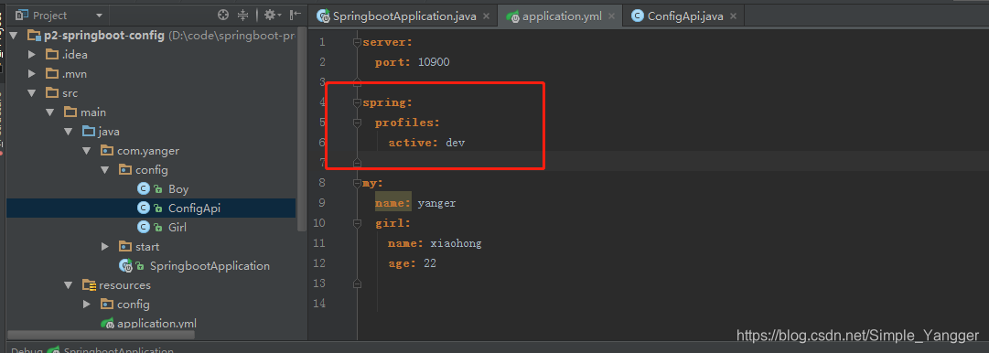 所以现在起作用的是 application-dev.yml 里面的配置,我们简单的在两个文件中设置了不同的 app.env 属性,至于怎么访问,我们稍后讲到。
