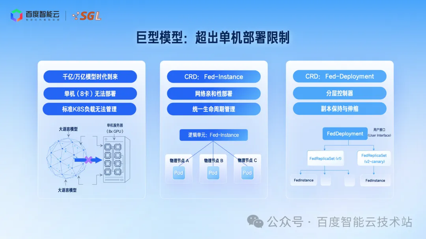 通过 FedDeployment,我们成功地扩展了 Kubernetes API,为分布式工作负载提供了一种声明式的、应用感知的抽象,从根本上解决了巨型模型部署和运维的核心管理难题。