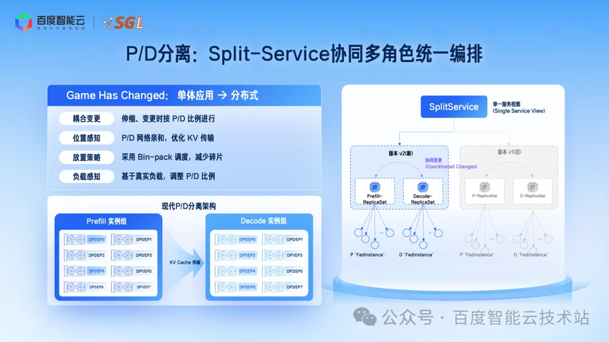 为应对这一挑战,百度百舸设计了 SplitService,它为 P/D 分离架构提供了一个单一的服务视图(Single Service View),从而实现了对两个角色的统一编排。