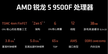 AMD 方面,锐龙 5 9500F 采用单 CCD 设计,搭载 6 颗支持 SMT 同步多线程技术的核心,未集成对游戏玩家冗余的 CPU 内置显示核心。另外,它搭载 Zen 5 架构,其 IPC(每时钟周期指令数)较锐龙 5 7500F 的 Zen 4 架构提升 16%。工艺层面,锐龙 5 9500F 由 TSMC 5nm FinFET 升级为 TSMC 4nm FinFET,提升了能效比;Zen 5 架构内部优化亦十分丰富:解码器从 4 宽度升级至 8 宽度,分支预测启用更大容量 TAGE,每周期可处理 2 个执行分支;浮点执行单元方面,该处理器集成支持 AVX-512 的 128bit SIMD 单元(队列深度 384),配备 6 个 2 周期延迟 FADD 单元,每周期可处理 6 个浮点指令,延迟从 3 周期降至 2 周期,浮点运算能力大幅提升,进一步优化游戏性能表现。频率与功耗方面,锐龙 5 9500F 最高加速频率为 5.0GHz,基准时钟频率为 3.8GHz;其 TDP 热设计功耗为 65W,最高标称插槽功耗 88W。