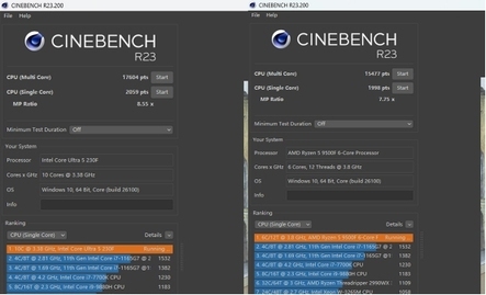 根据参数对比,我们可以看到在 CPU 基准性能方面,英特尔酷睿 Ultra 5 230F 于三项测试中均能在一定程度上领先 AMD 锐龙 5 9500F。其中 3DMARK CPU Profile 的成绩差异最大——英特尔酷睿 Ultra 5 230F 在最大线程分数方面得到了 8631 分,而 AMD 锐龙 5 9500F 仅有 5906。而在 CINEBENCH 中,英特尔酷睿 Ultra 5 230F 分别得到 2059 的单核分数以及 17604 的多核分数,AMD 锐龙 5 9500F 则分别为 1998 的单核分数以及 15477 的多核分数。当然,CPU 的实际测试分数并不能完全代表它们辐射到游戏上的优势。