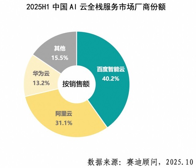 11 月 19 号消息,国内领先的市场研究机构赛迪顾问近日发布《2025H1 中国 AI 云全栈服务市场份额报告》。报告显示,2025 年上半年,中国 AI 云全栈服务市场规模达 280.9 亿元,同比增长 195.7%。百度智能云凭借从 AI 基础设施(AI Infra)、智能体基础设施(Agent Infra)到智能应用的全栈能力,以 40.2%的市场份额位居市场第一。