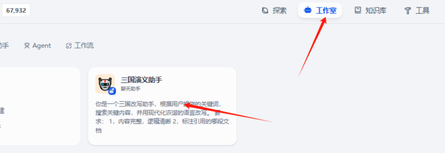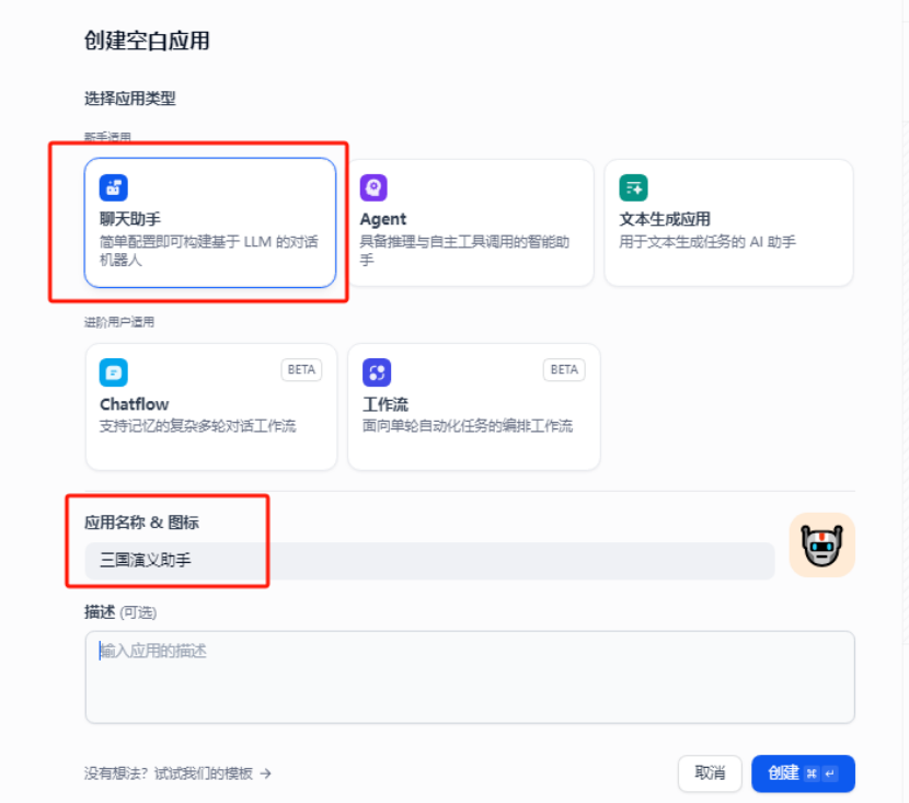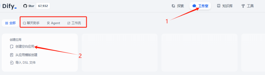 点击工作室,我们可以看到有很多丰富的应用,包括聊天助手、agent、工作流等我们选择最简单的应用,聊天助手,点击 5,创建空白应用