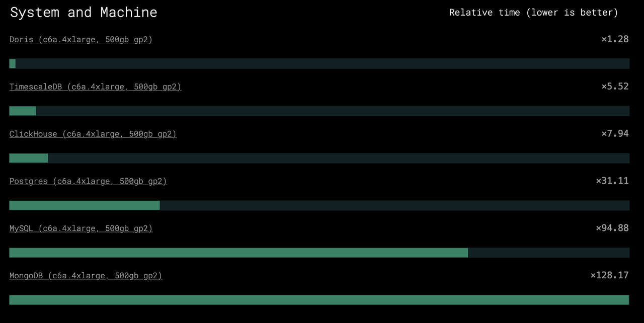 Doris(c6a.4xlarge,500GB gp2)查询性能得分仅为 ×1.28,在此项指标上位列第一,其性能接近排名第二的 TimescaleDB 的 4 倍,ClickHouse 的 6 倍,PostgresSQL 的 30 倍,MongoDB 的 100 倍。