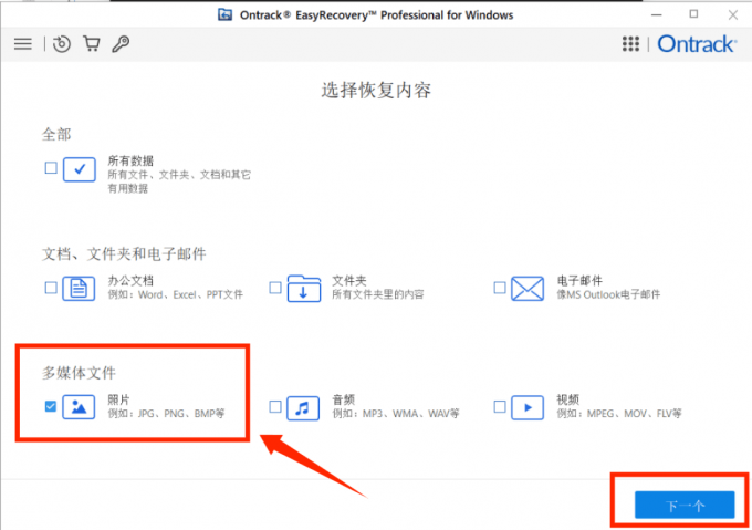 1、在 EasyRecovery 软件界面选择被删除的文件类型,在这里我们选择“照片”,随后点击“下一个” 。