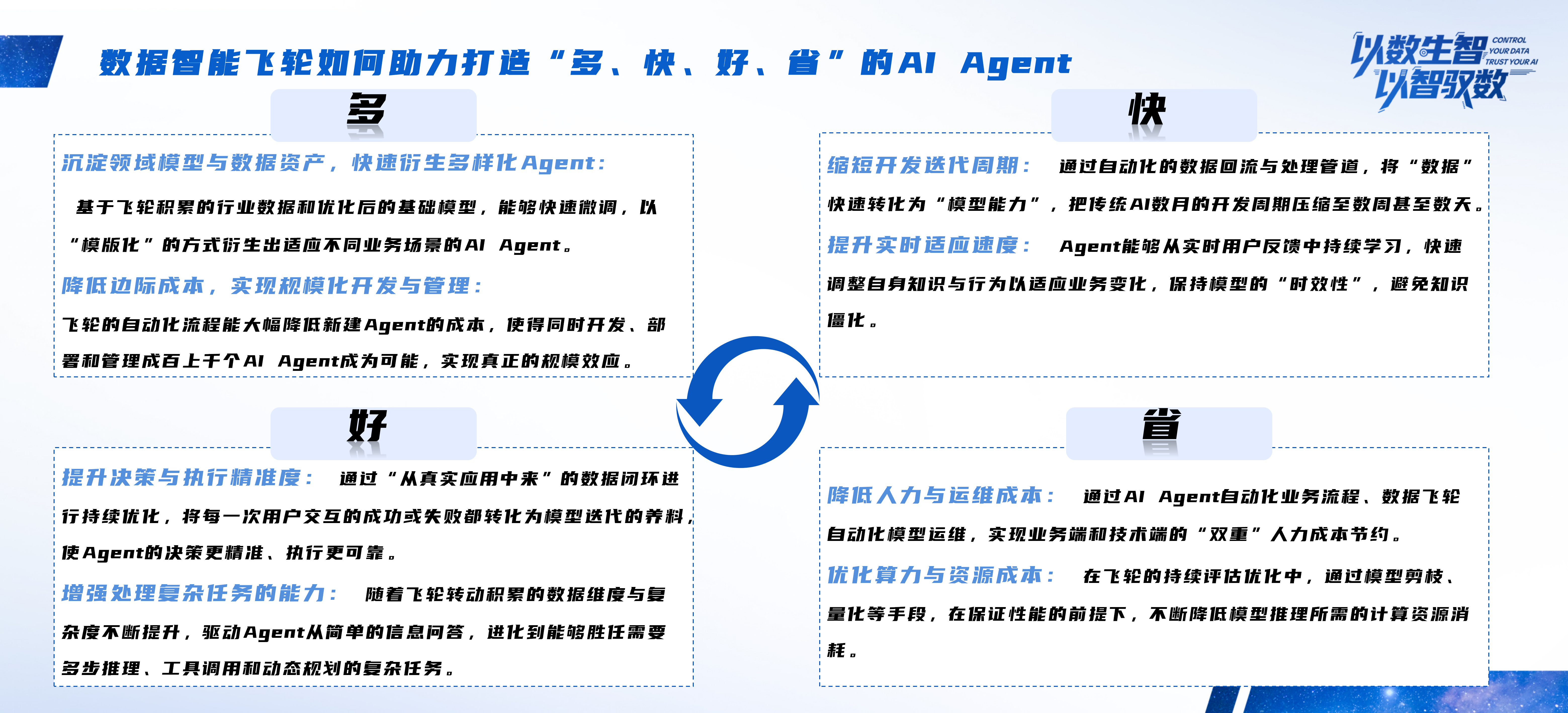 这意味着,AI 不仅要能从数据中学习,更要能反过来管理和优化数据,形成一个自我强化的智能闭环。我们称之为新一代的“智能数据飞轮”,并围绕“多、快、好、省” 四个关键点来构建: