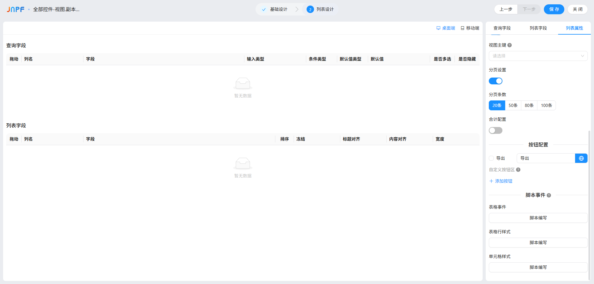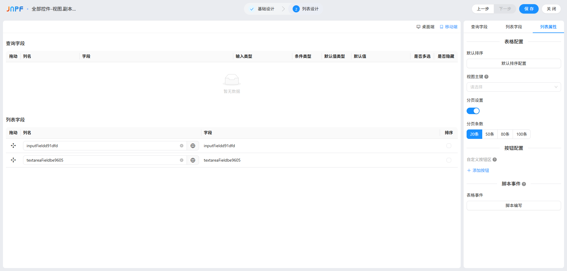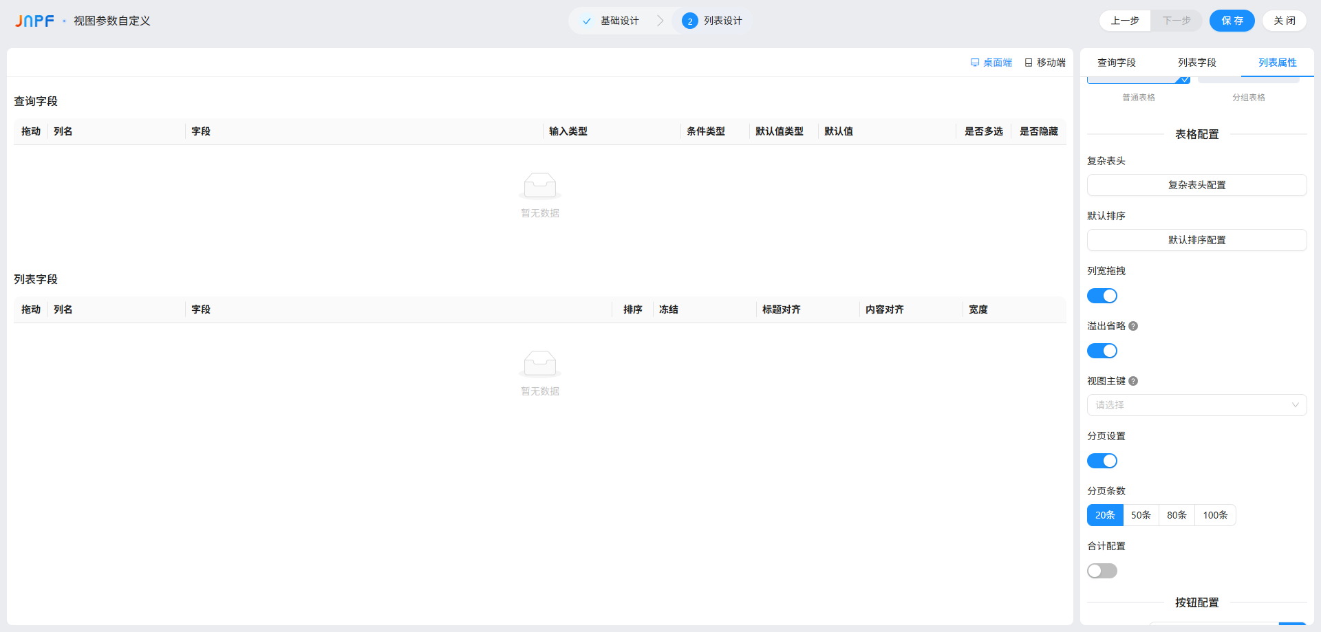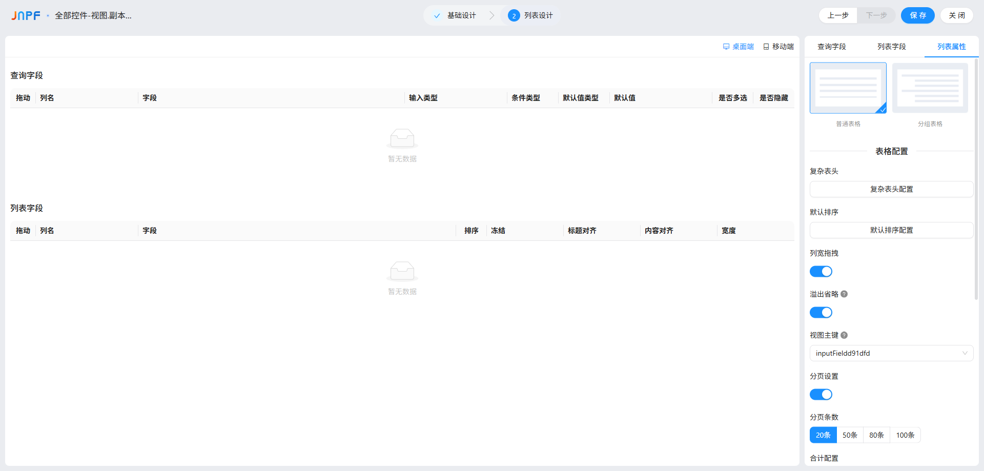 页面默认分 “查询字段”“列表字段”“列表属性” 三大块,还能切换 “PC 端 / 移动端” 分别配置(两者差异很大,后面重点讲),每个配置项都有明确的开关和参数,跟着步骤来基本不会错。