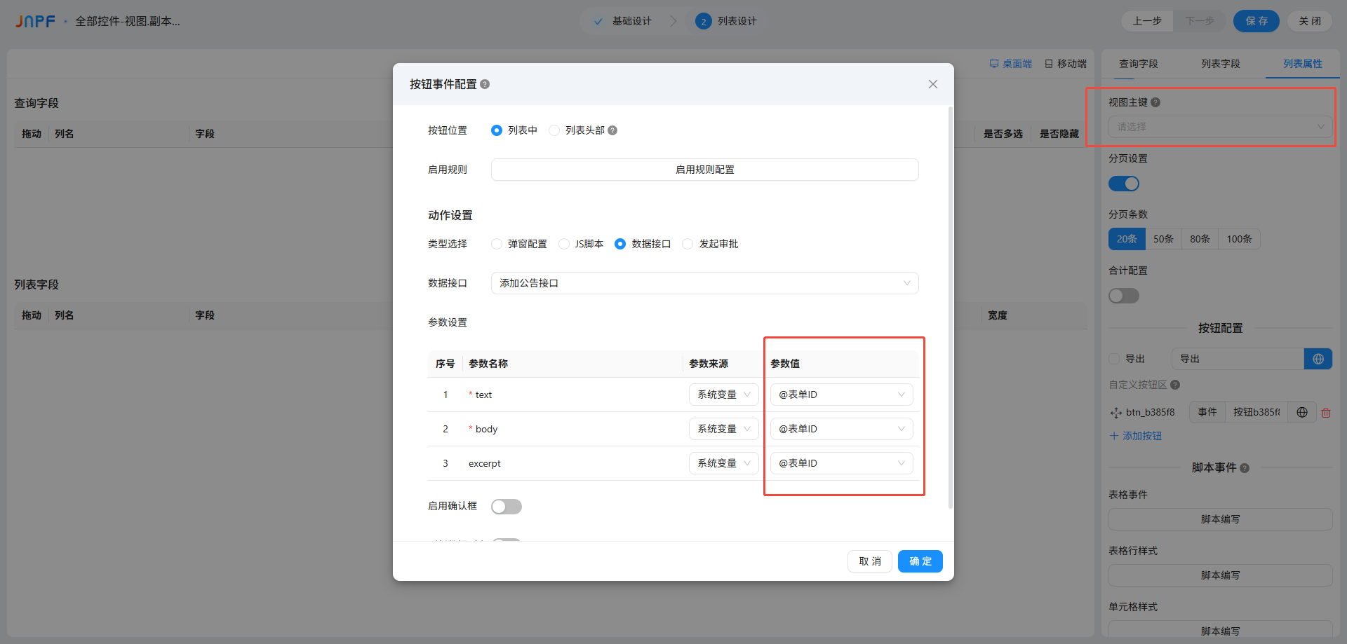 - 分页设置无法关闭?接口是 “真分页”(接口自带 page、size 参数),系统会锁定分页设置,只能通过接口调整分页逻辑,无法在列表设计中关闭。
